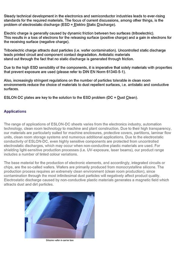 Due to the hazardous impact ESD may have on semiconductor devices during the production process, it is absolutely essential to use only materials which inherently exclude the emission of any electrostatic discharge. Please also see EN 100015-1 for reference.